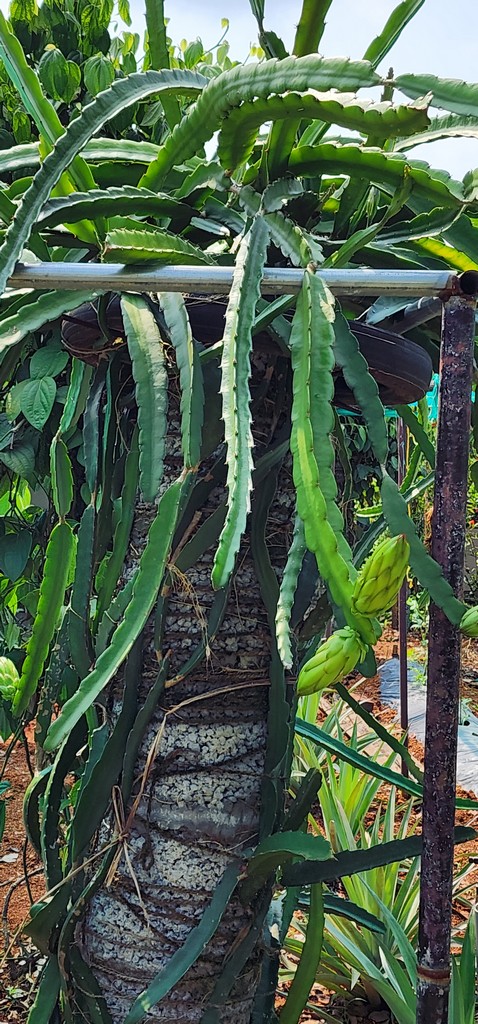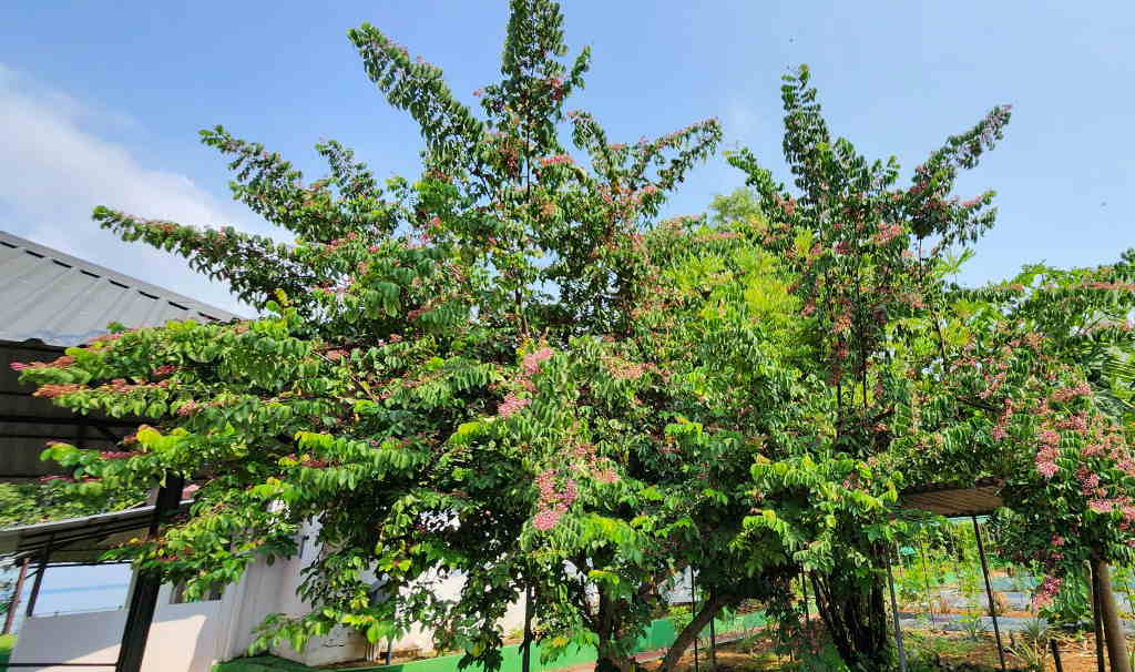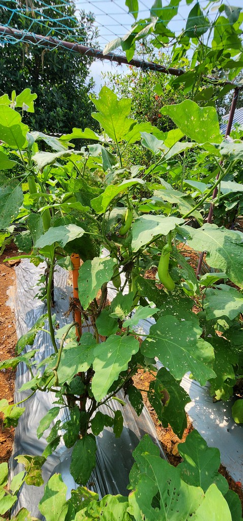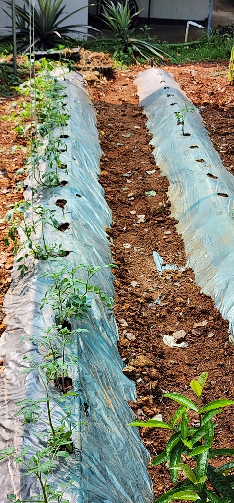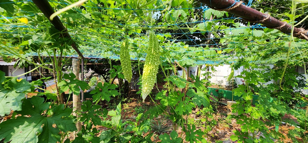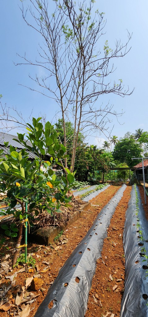 Elevated organic garden beds thriving with vegetables at Kumarakom Hotel Illikkalam.